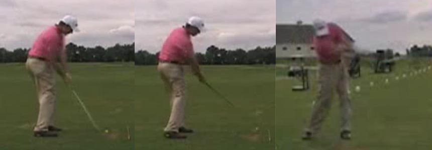 Following up on my post- (thanks for the slow motion video Jeff and the still frames!) - My guess on the "cause" of Nathan's issue is that he has worked on keeping a steady head - yet transferring that thought into a "no weight shift feel"- because it is easy when your weight shifts to the left side to feel as if you are moving the head. As a result of working on head still- the arms go around the hips so that the weight doesn't shift and you don't get a feeling of moving but more a feeling of staying centered. It's using a valid visual que (head still) and translating it into an invalid feel que. Easy to do! That's also why on the backswing the shaft is slightly laid off as the head still concept has unknowingly limited some rotation and proper loading of the club. (Please don't read this and think I believe that you should try to move your head- that's not what I'm saying)