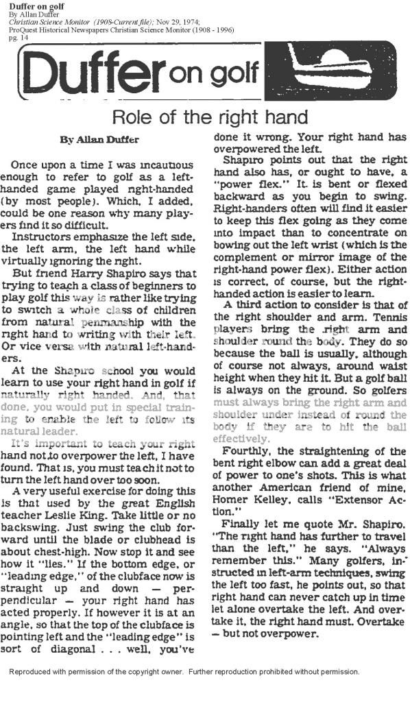 The primary use of the Aiming Point concept is to control Automatic Releases, both Sweep and Snap. For the Short Shots, I personally use the alternative Impact Hand Location procedure and look at the Ball. When using the Push Basic Stroke, I am very aware of Pushing the Right Forearm through Impact directly toward the Plane Line along the line the Forearm is positioned.
