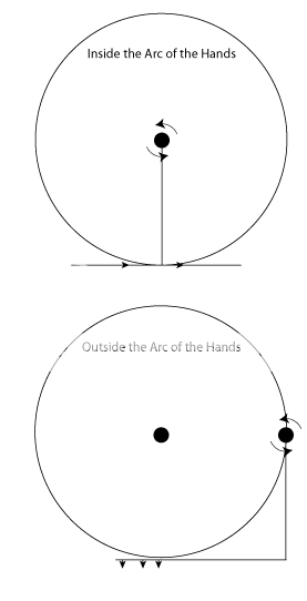 The diagrams below illustrate holding the Clubhead inside the Arc of the Hands and then what happens when we allow the Center of the Clubhead Arc to move to the Left Shoulder. When we move the Center of the Clubhead Arc to the Left Shoulder, the Clubhead moves outside the Arc of the Hands.
